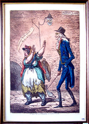 From Catalogue of political and personal satires preserved in the Department of Prints and Drawings in the British Museum: vol VIII - 1801-1810: "A street scene lit by a lamp projecting from a high brick wall: Maiden Lane. A tall man, very thin and pale, walks (r. to l.), wearing spectacles, a cane in his r. hand. His shoulders are thickly sprinkled with powder. He terrifies an Irish fishwife, who holds up both arms to avert the spectre, turning away with a terrified stare, saying Governor Wall's Ghost! by J.....s! Her basked of fish falls to the ground. The man is corpse-like, and his clothes seem to hang on a skeleton. The woman is stout and very ragged. Besider her a tunnel penetrates the wall, slanting down from street level, under an arch inscribed Cyder Cell[ars], a famous night resort in Maiden Lane.