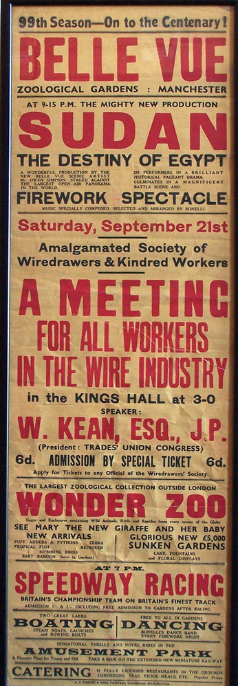 Scope and ContentFramed playbill for the 99th season of Belle Vue Zoological Gardens advertising a meeting to be held by the Amalgamated Society of Wiredrawers and Kindred Workers on Saturday 21 September [1935], along with details of other attractions in the gardens