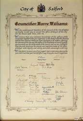 Scope and ContentPetition to Councillor Harry Williams inviting him to serve as Mayor of Salford 1973-74, and signed by the Mayor, Deputy Mayor and various Aldermen and Councillors
