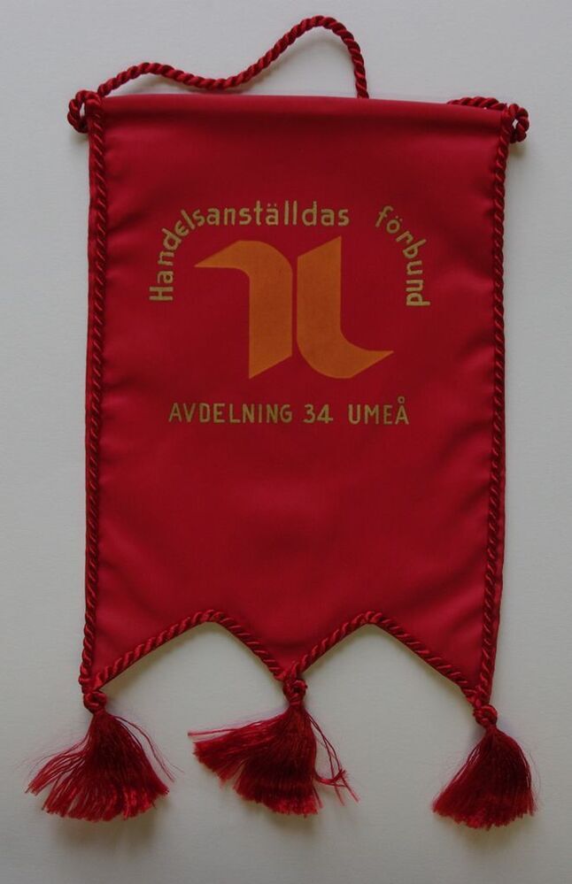 Scope and ContentRed satin with orange stripe symbol and lettering "Handelsanstalldas forbund. Avdelning 34 UMEA"