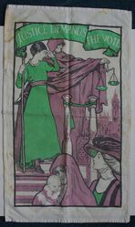 Scope and ContentGreen, white and purple showing female figures and the figure of Justice "Justice demands the vote"
