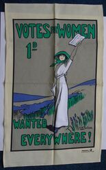 Scope and ContentCream with green and blue lettering and illustration of female figure "Votes for Women 1d. wanted everywhere"