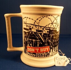 Scope and ContentWapping Dispute 1986 mug. Wrap around illustration of barbed wire and buildings. Front - Badge with newspaper and text - 'NGA, SOGAT, NUJ, AUEW, Wapping Dispute 1986'. Below are names of newspapers. On base - Limited edition - Issued by Londons Printworkers on behalf of their members in the dispute at News International, Wapping. February 1986