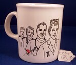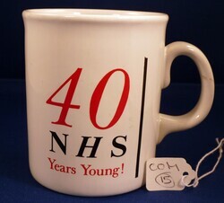 Scope and ContentNHS 40 year anniversary mug. Front text - '40 NHS Years Young'. Back illustration - NHS workers with red rose.
