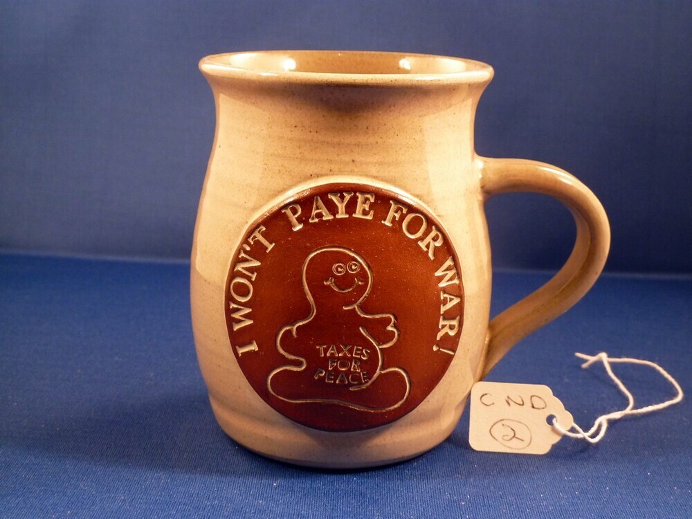 Scope and ContentTaxes for Peace mug. Front - Badge and outline of cartoon person. Text - Outside 'I Won't PAYE For War', Inside 'Taxes For Peace'.
