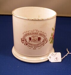 Scope and ContentAccrington and Church Industrial Co-operative Society Ltd, Jubilee Souvenir 1910 mug. Front and back: flower motif. Side motif: circular badge with clasped hands and text: Unity is Strength. Base motif: wheatsheaf, spade and sickle
