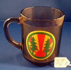 Scope and ContentThe Woodcraft Folk mug. Circular Woodcraft Folk Badge. Green trees with red and orange suns rays radiating out.