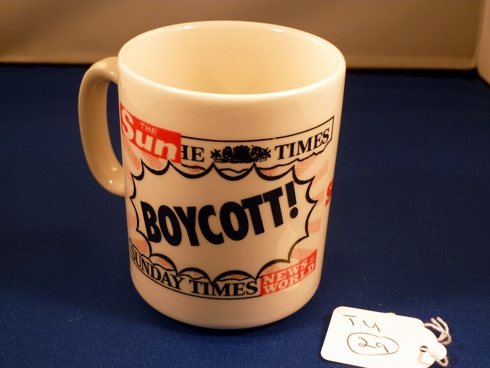 Scope and ContentNational Graphical Association and Society of Graphical and Allied Trades 1982, Official Dispute 1986 mug. Front: Text - 'BOYCOTT!', text above and below - 'The Sun, The Times, The Sunday Times, News of the World'. Back: Text - 'NGA, SOGAT, AUEW official dispute 1986'.