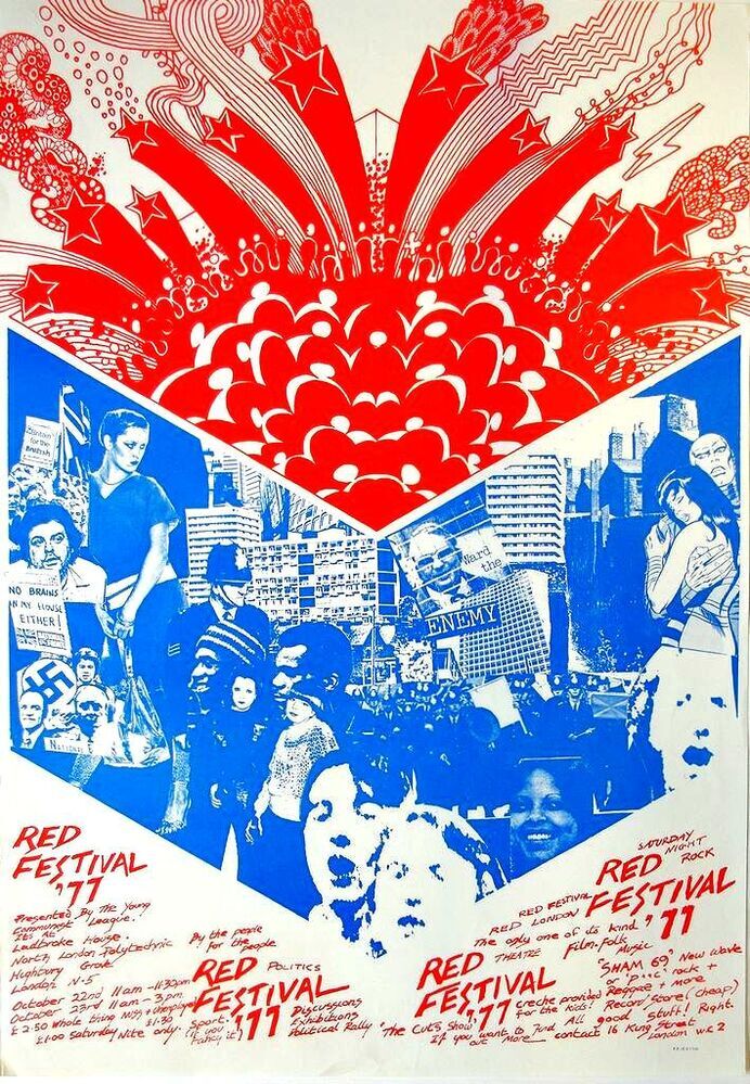Scope and ContentPoster advertising the Red Festival '77 to be held on 22-23 Oct in London. Illustrated with a montage of images and text detailing the acts scheduled to be playing at the festival. Presented by the Young Communist League