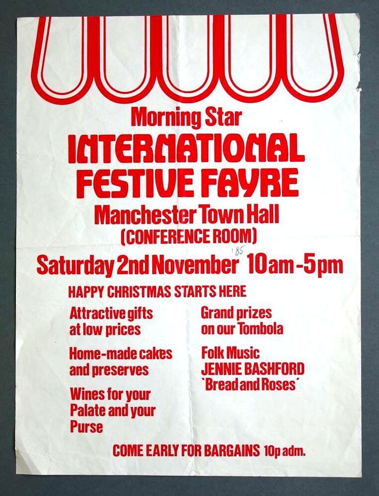 Scope and ContentPoster advertising an event: Morning Star international festive fayre on Sat 2 Nov in Manchester Town Hall.