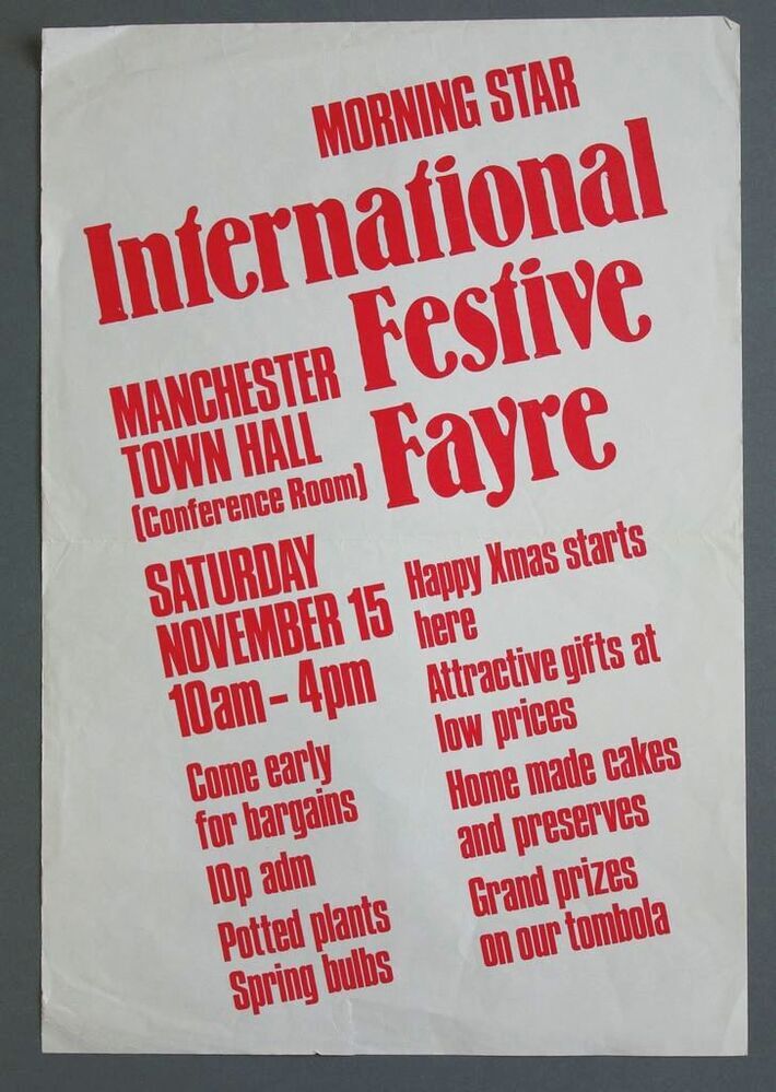Scope and ContentPoster advertising an event: Morning Star international festive fayre on Sat 15 Nov in Manchester Town Hall.