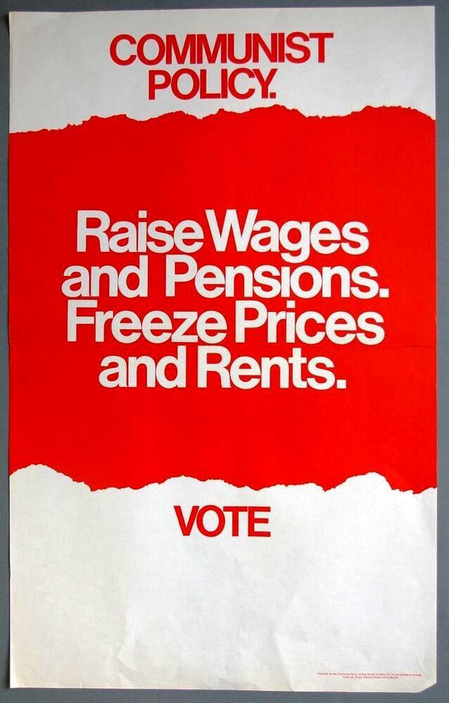 Scope and ContentPoster with the text: Communist Policy. Raise wages and pensions. Freeze prices and rents. Published by the Communist Party.