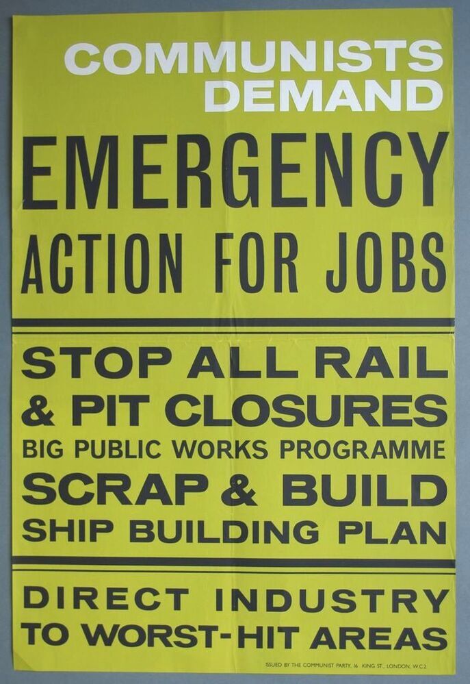 Scope and ContentPoster with the text: Communist demand emergency action for jobs. Stop all rail and pit closures. Big public works programme. Scrap and build ship building plan. Direct industry to worst-hit areas. Issued by the Communist Party.