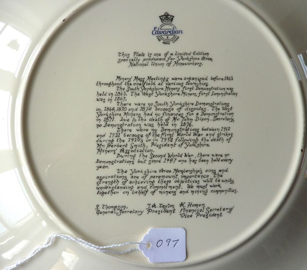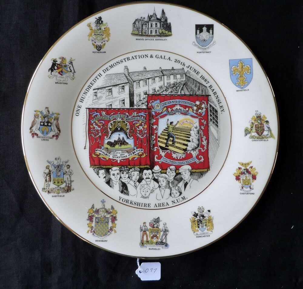 Scope and ContentPlate to celebrate 100th demonstration and gala of the National Union of Mineworkers, Yorkshire Area held in Barnsley on 20 Jun 1987, with a central image of the demonstration and town coats of arms round the rim