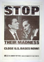 Scope and ContentPoster with images of Ronald Reagan and Margaret Thatcher and the text: Stop their madness, close US bases now! 7 days The Communist Party Paper. Published by the Communist Party.