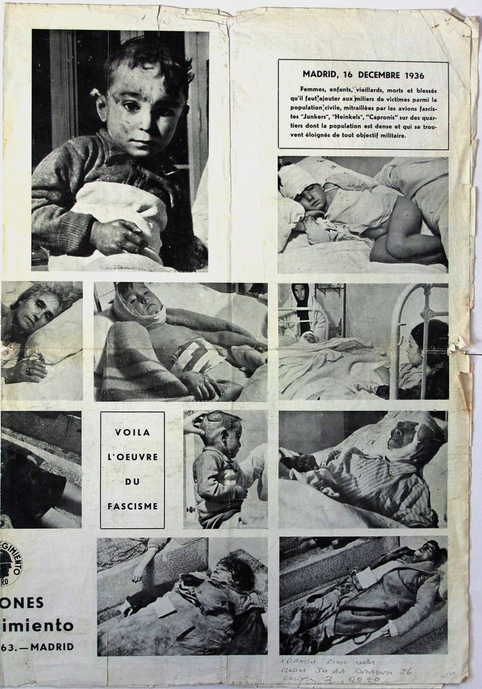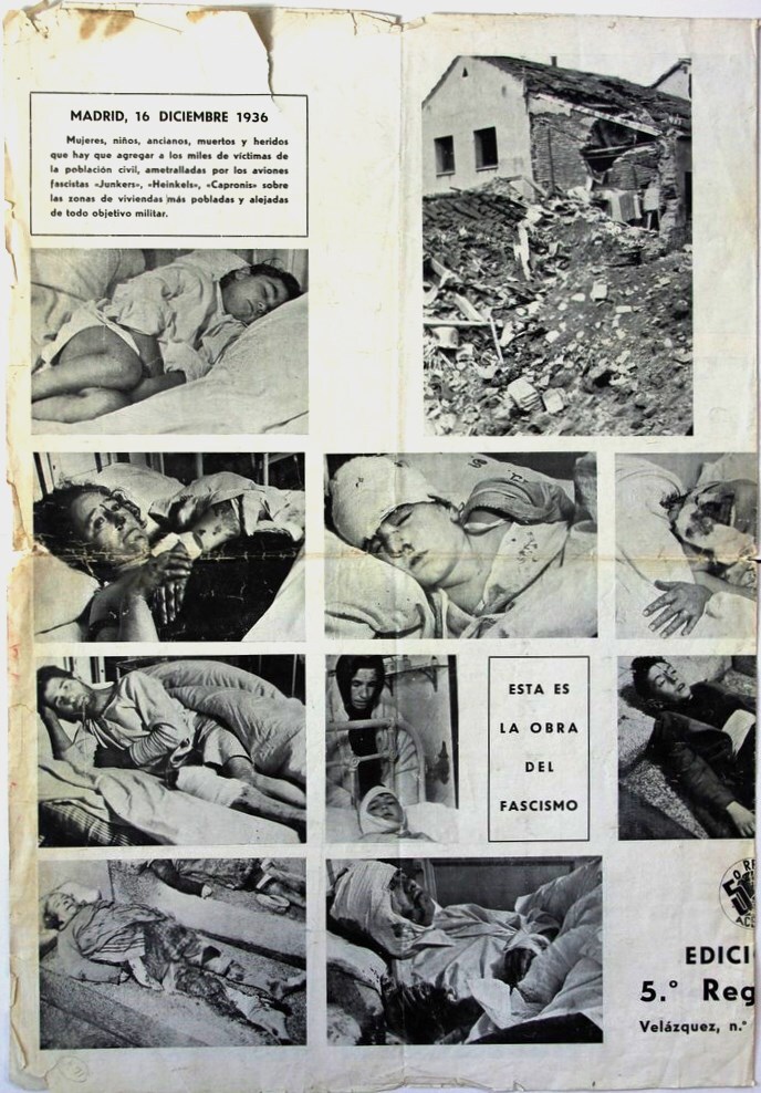 Scope and ContentBlack and white poster showing photographs of people injured and killed in bombings in Madrid on 16 December 1936. Produced by Ediciones 5 Regimiento (Acero), Madrid