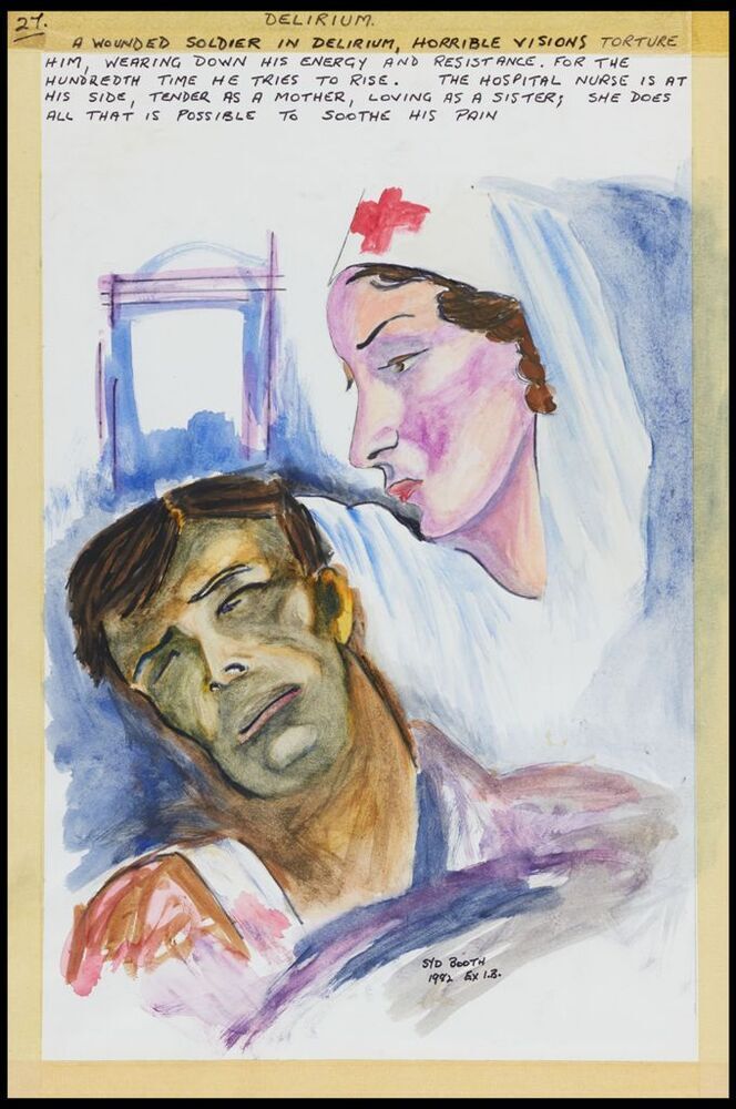Scope and ContentWatercolour by Syd Booth after SIM XXXVI with the text - A wounded soldier in delirium, horrible visions torture him, wearing down his energy and resistance. For the hundredth time he tries to rise. The hospital nurse is at his side, tender as a mother, loving as a sister; she does all that is possible to soothe his pain.