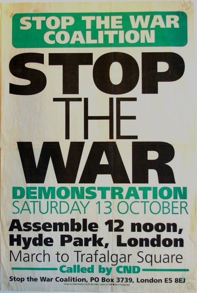 Scope and ContentPoster with the text: Stop the War Coalition. Stop the war. Demonstration Saturday 13 October. Assemble 12 noon, Hyde Park, London. March to Trafalgar Square. Called by CND
