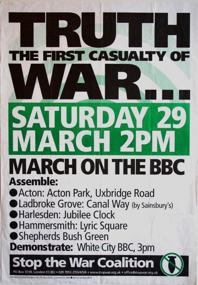 Scope and ContentPoster with the text: Truth. The first casualty of war. Saturday 29 March, 2pm. March on the BBC. With assembly points