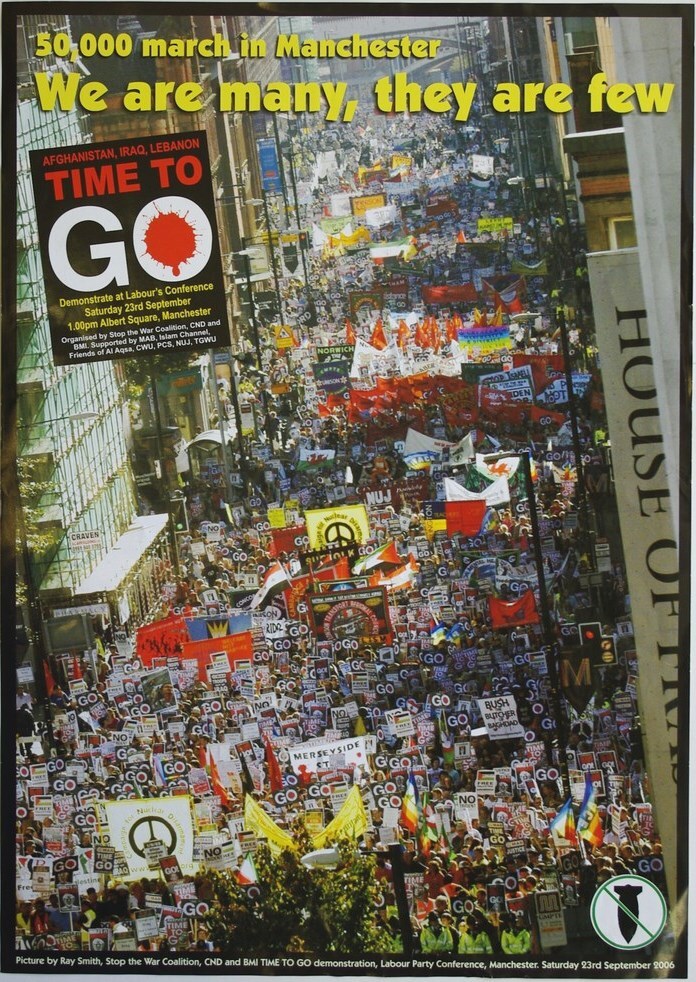 Scope and ContentPoster with a photograph of a demonstration in Manchester and the text: 50,000 march In Manchester. We are many, they are few. Afghanistan, Iraq, Lebanon. Time to go. Demonstrate at Labour's Conference Saturday 23rd September, 1.00pm Albert Square, Manchester