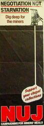 Scope and ContentPoster with an image of a pit head and shaft and the text: Negotiation not starvation. Dig deep for the miners. Support your Chapel collections. NUJ Campaigning for miner's meals. Produced by the National Union of Journalists.