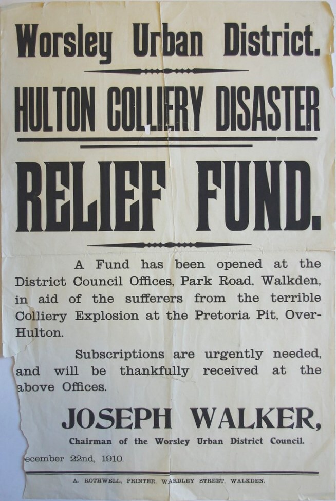 Scope and ContentPoster with the text: Worsley Urban District. Hulton Colliery disaster relief fund. A fund has been opened at the District Council offices, Park Road, Walkden, in aid of the sufferers from the terrible colliery explosion at Pretoria Pit, Over Hulton. Subscriptions are urgently needed, and will be thankfully received at the above offices. Joseph Walker, Chairman of the Worsley Urban District Council