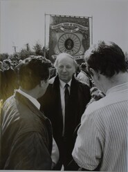 Scope and ContentPhotograph of Arthur Scargill at Parkside colliery 1993 with an National Union of Mineworkers, Yorkshire area banner in the background