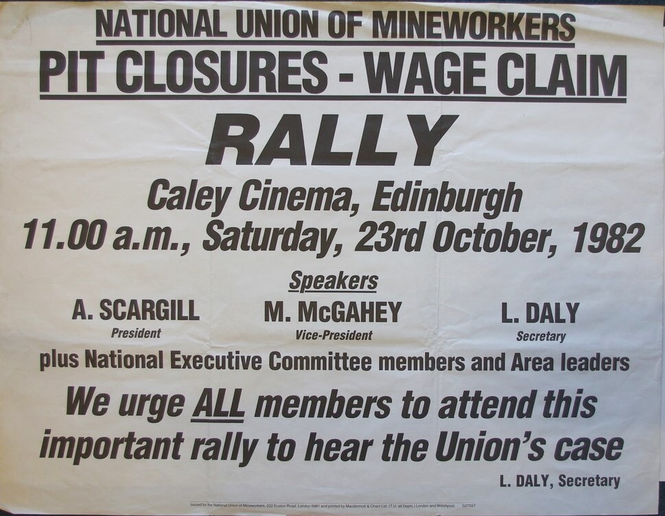 Scope and ContentPoster with the text: National Union of Mineworkers. Pit closures - wage claim. Rally. Caley Cinema, Edinburgh 11.00am Saturday 23 October 1982. Speakers: A Scargill, President; M McGahey, Vice President; L Daly, Secretary, plus National Executive Committe members and Area leaders. We urge all members to attend this important rally to hear the Union's case.