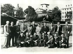 Scope and ContentCopy of a photograph of a group of 18 men and one woman, taken in Trafalgar Square. Standing from the left: 1. Unknown; 2. Sam Wild; 3. Unknown; 4. Bob Clarke; 5. Unknown; 6. Lester Hutchinson; 7. Nan Green; 8. Enrique Lister. Front row 3rd right, Jack Coward, with briefcase in front of him. [2 copies]