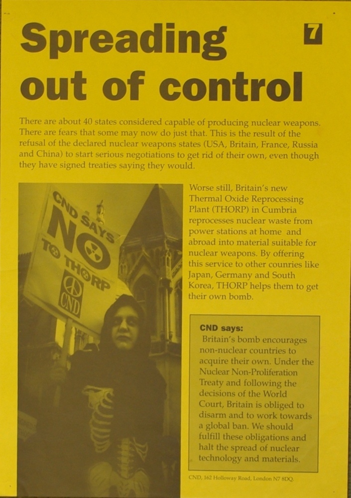 Scope and ContentPoster with an image of a demonstrator with a CND placard and the text: Spreading out of control. there are about 40 states considered capable of producing nuclear weapons. There are fears that some may now do just that. This is the result of the refusal of the declared nuclear weapons states (USA, Britain, France, Russia and China) to start serious negotiations to get rid of their own, even though they have signed treaties saying they would. Worse still, Britain's new Thermal Oxide Reprocessing Plant (THORP) in Cumbria reprocesses nuclear waste from power stations at home and abroad into material suitable for nuclear weapons. By offering this service to other countries like Japan, Germany and South Korea, THORP helps them get their own bomb. CND says: Britain's bomb encourages non-nuclear countries to acquire their own. Under the Non-Proliferation Treaty and following the decisions of the World Court, Britain is obliged to disarm and work towards a global ban. We should fulfill these obligations and halt the spread of nuclear technology and materials.