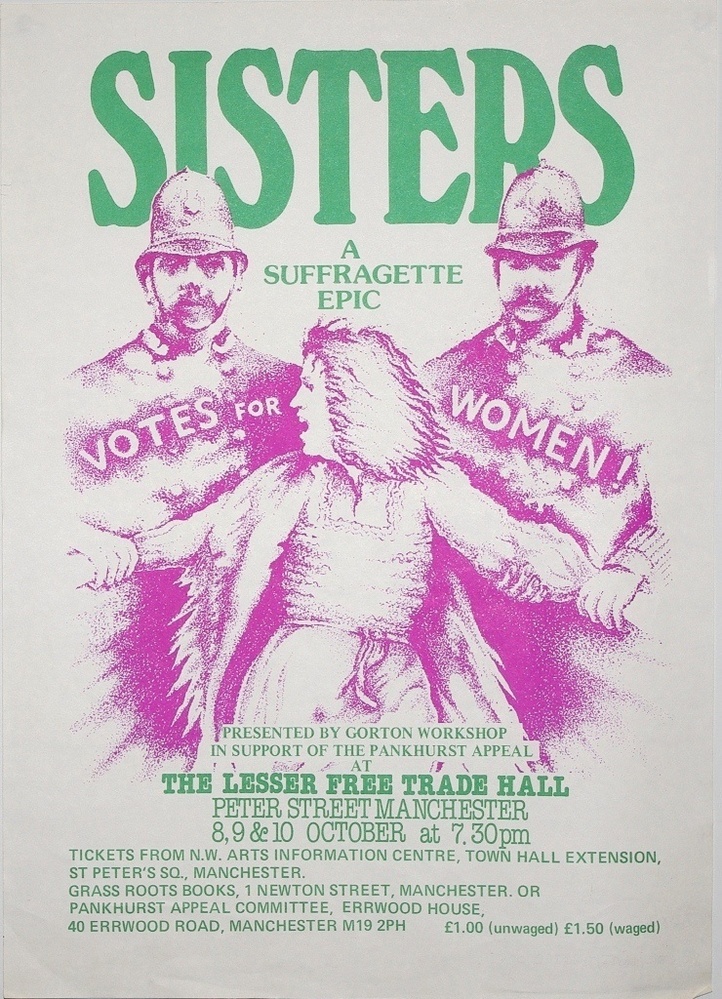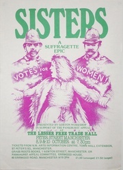 Scope and ContentPoster - Sisters. A suffragette epic presented by Gorton Workshop in support of the Pankhurst Appeal at the Lesser Free Trade Hall, Manchester 8-10 Oct [no year]