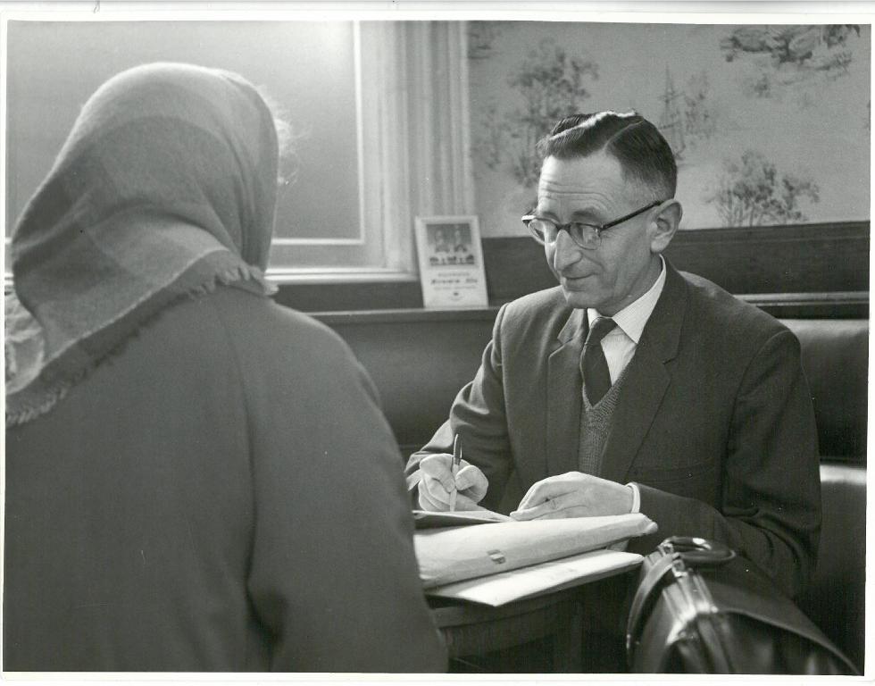 Scope and ContentBlack and white photograph of Frank Allaun talking to woman (constituent?) with her back to the camera