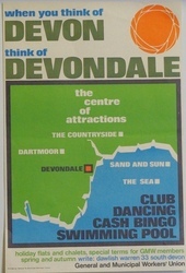 Scope and ContentPoster with an image of Devon with various attractions highlighted and the text: When you think of Devon, think of Devondale. Club, dancing, cash bingo, swimming pool. Holiday flats and chalets, special terms for GMW members, spring and autumn.