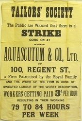 Scope and ContentPoster with the text: Tailors' Society. The public are warned that there is a strike going on at Messrs. Aquascutum & Co. Ltd. of 100 Regent St., a firm patronised by the Royal Family and the work of the firm is done by sweated labour of the worst description, workers getting paid 3d per hour resulting in them working 79 to 84 hours per week