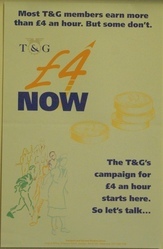 Scope and ContentPoster with images of workers and 4 pound coins and the text: £4 now. Most T&G members earn more than £4 an hour. But some don't. The T&G's campaign fro £4 an hour starts here. So lets talk ...
