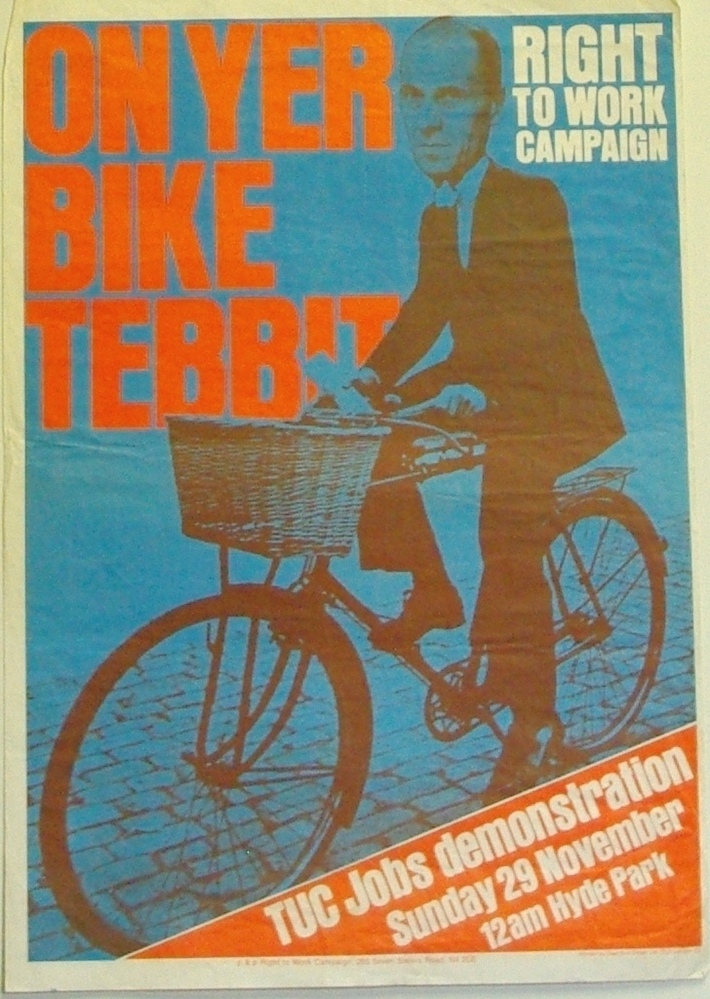 Scope and ContentPoster with an image of Norman Tebbit on a bicycle and the text: On yer bike Tebbit. Right to work campaign. TUC Jobs demonstration Sunday 29 November 12am Hyde Park