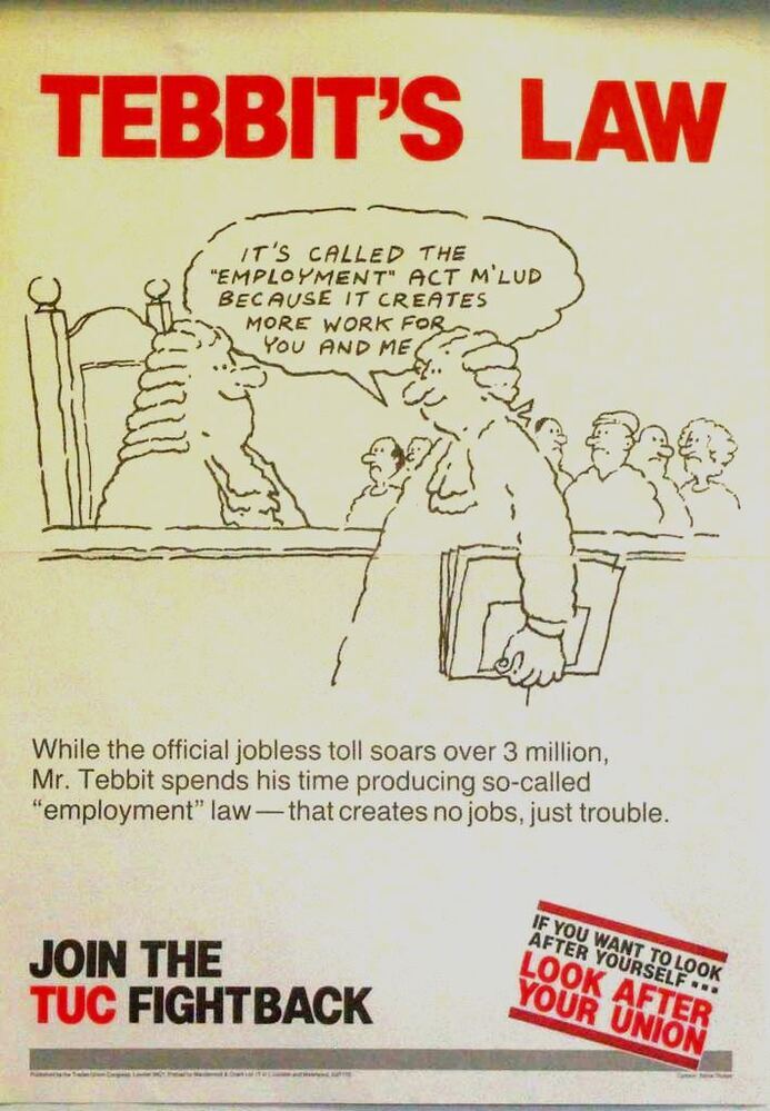 Scope and ContentPoster with a cartoon showing a lawyer saying to a judge "It's called the employment act m'lud because it creates more work for you and me" and the text: Tebbit's law. While the official jobless toll soars over 3 million Mr Tebbit spends his time producing the so-called employment law - that creates no jobs, just trouble. Join the TUC fightback