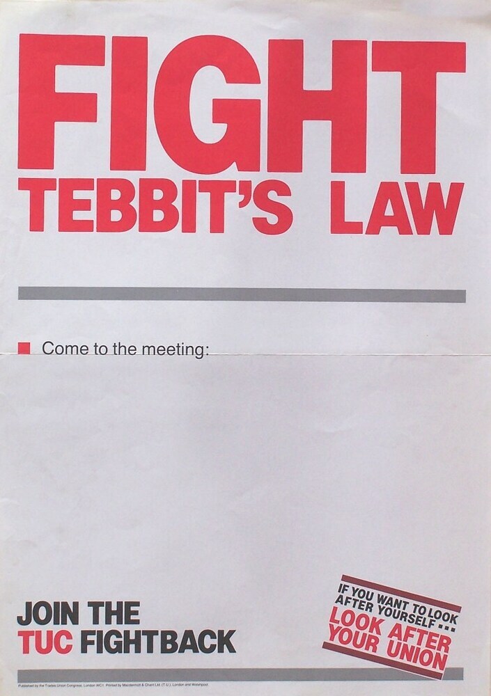 Scope and ContentPoster with the text: Fight Tebbit's law. Come to the meeting: Join the TUC fightback