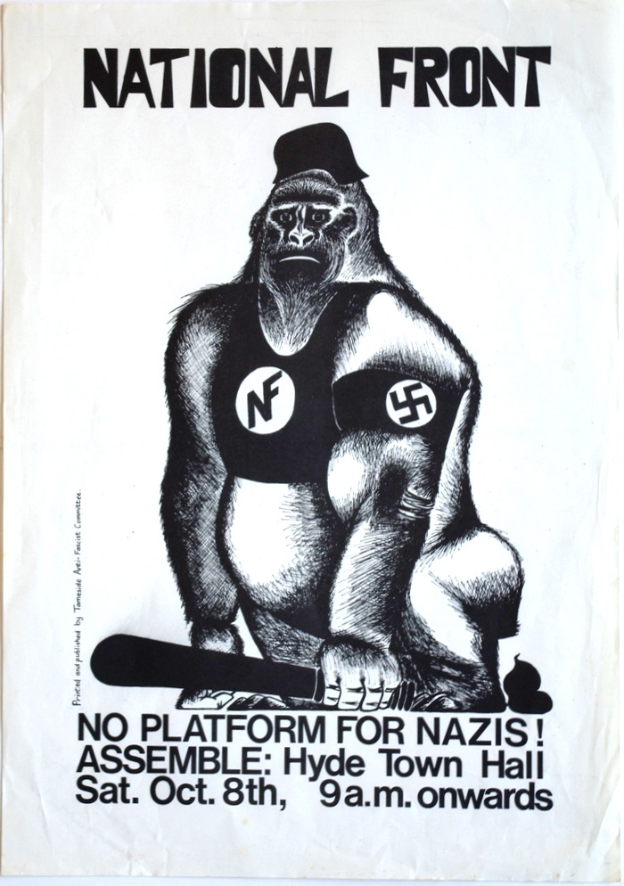 Scope and ContentPoster with an image of a gorilla wearing a National Front vest and a swastika armband and the text: National Front No platform for Nazis! Assemble: Hyde Town Hall, Sat 8 Oct, 9am onwards. Printed and published by Tameside Anti-Fascist Committee.