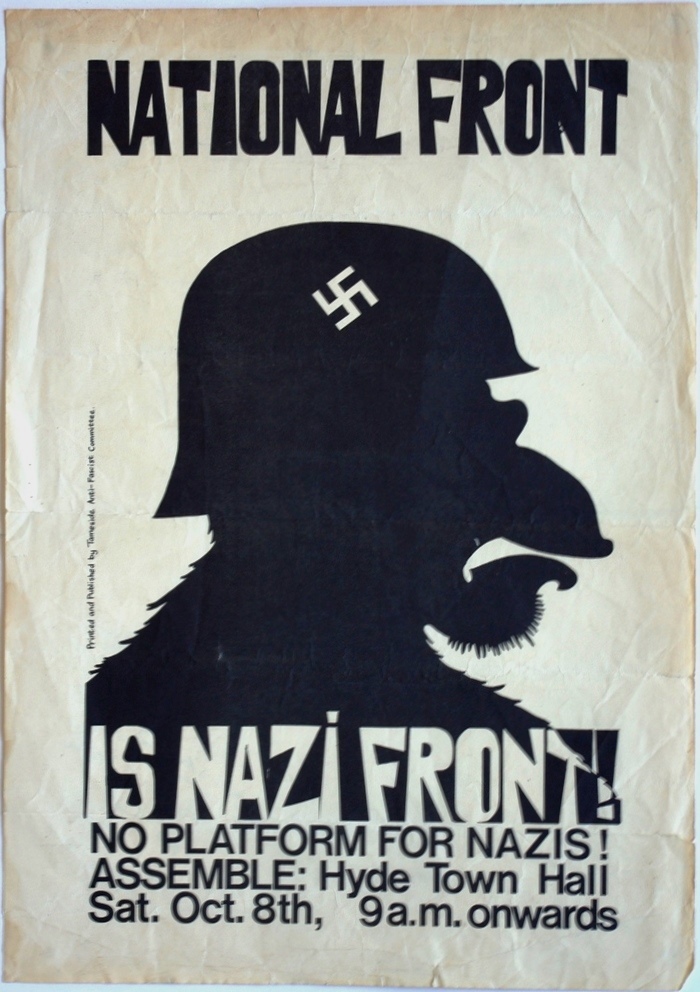 Scope and ContentPoster with an cartoon of a gorilla in a Nazi helmet and the text: National Front is Nazi Front! No platform for Nazis! Assemble: Hyde Town Hall, Sat Oct 8th, 9am onwards. Printed and published by Tameside Anti-Fascist Committee.