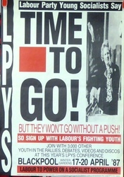 Scope and ContentPoster with a photograph of Margaret Thatcher and the text: Labour Party Young Socialists say time to go! But they won't go without a push! so sign up with Labour's fighting youth. Join with 3,000 other youth in the rallies, debates, videos and discos at this year's LPYS conference, Blackpool Winter Gardens, 17-20 April '87. Labour to power on a socialist programme