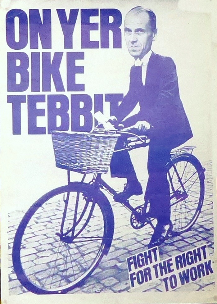 Scope and ContentPoster with an image of Norman Tebbit on a bicycle and the text: On yer bike Tebbit Fight for the right to work'
