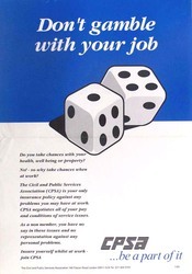 Scope and ContentPoster with an image of a pair of dice and the text: Don't gamble with your job. do you take chances with your health, well being or property? No! - so why take chances when at work? The Civil and Public Services Association (CPSA) is you only insurance policy against any problems you may have at work. CPSA negotiates all of your pay and conditions of service issues. As a non-member, you have no say in these issues and no representation against any personal problems. Insure yourself whilst at work - join CPSA