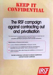 Scope and ContentPoster with the text: Keep it confidential. The IRSF campaign against contracting out and privatisation. The Government is increasing pressure on the Civil Service to market test and contract out its work. Their aim is clear: cut public spending by giving work to private contractors. Market testing of Revenue work means: a serious threat to confidentiality of taxpayers' records; the replacement of the traditional Civil Service commitment to impartiality and public service - with a commitment to profit; putting members' jobs, rates of pay and conditions at risk because of unfair competition. The IRSF is strongly opposed to unfair competition - support the IRSF campaign