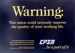 Scope and ContentPoster with the text: Warning:- this union could seriously improve the quality of your working life. For further information about joining The Civil and Public Services Association please contact your local representative