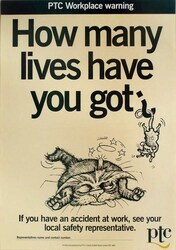 Scope and ContentPoster with the text: PTC workplace warning. How many lives have you got? If you have an accident at work see your local safety representative