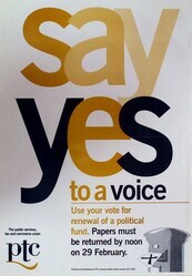 Scope and ContentPoster with the text: Say yes to a voice. Use your vote for renewal of a political fund. Papers must be returned by noon on 29 February