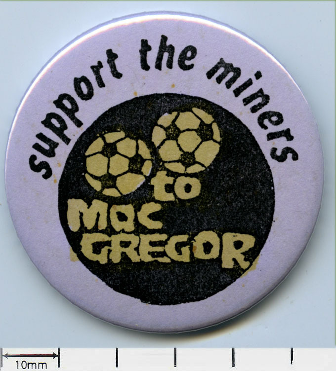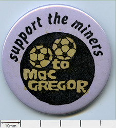 Scope and ContentPurple, Black and Yellow. Lettering Support the Miners. Illustration of 2 footballs then lettering - to MacGregor.