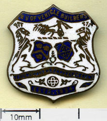Scope and ContentWhite, Blue, Gold. Vintage. NU of Vehicle Builders. Triumphant we Bravely Defend. ill. Coachmakers arms.