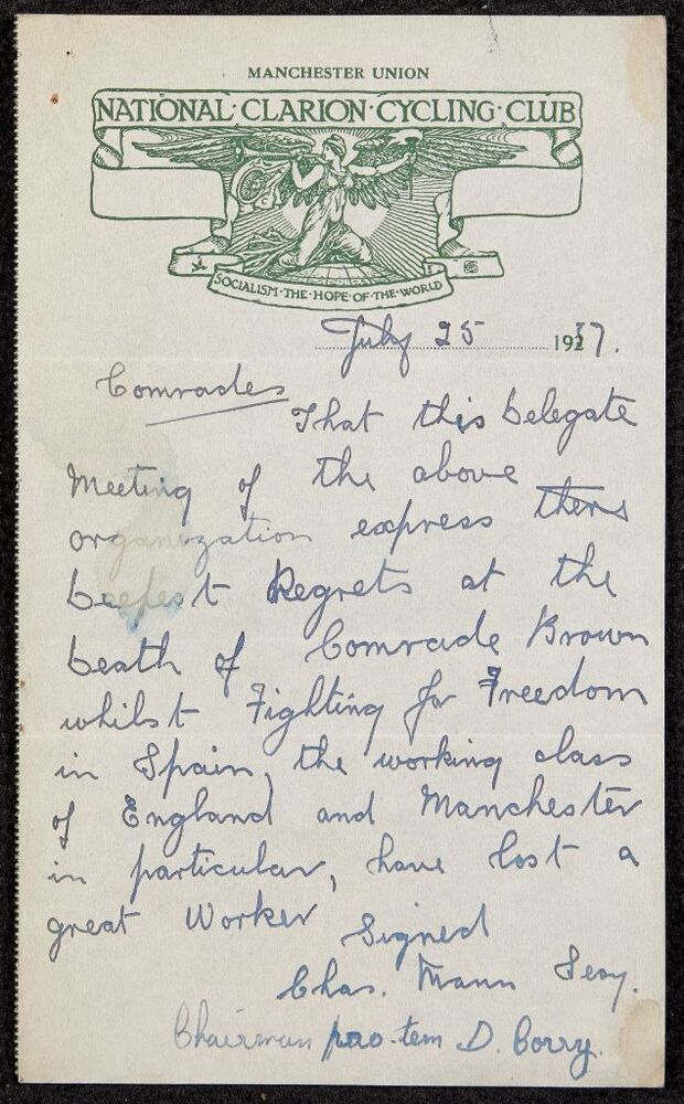 Scope and ContentHandwritten condolence letter from the Manchester Union of the National Clarion Cycling Club to comrades regarding the death of George Brown